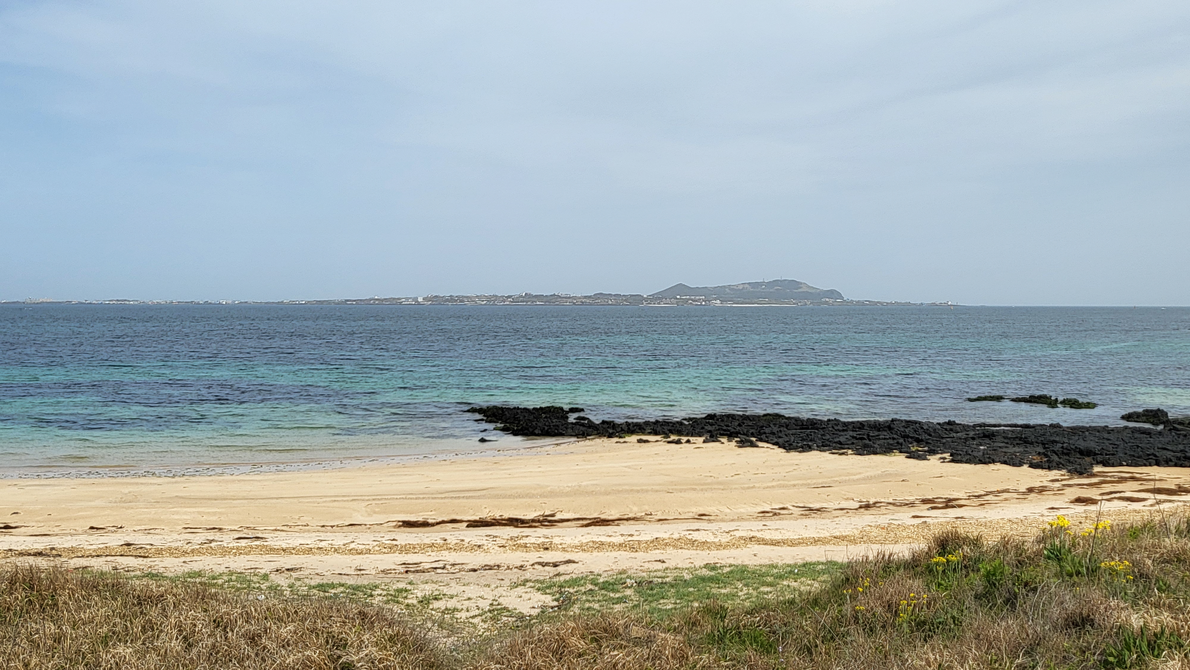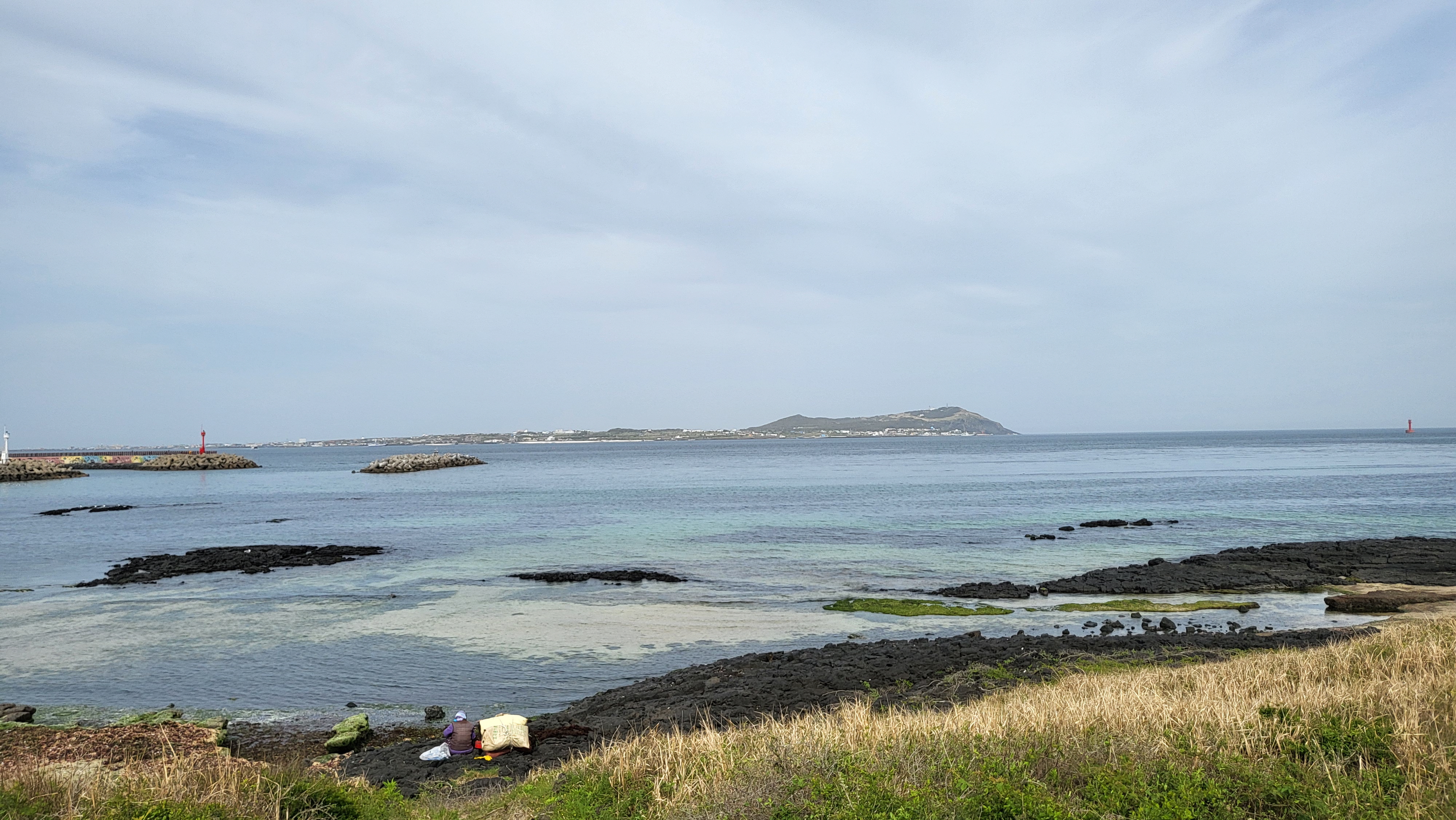 갯바위 너머로 토끼섬이 손에 잡힐듯 가까이 보인다.