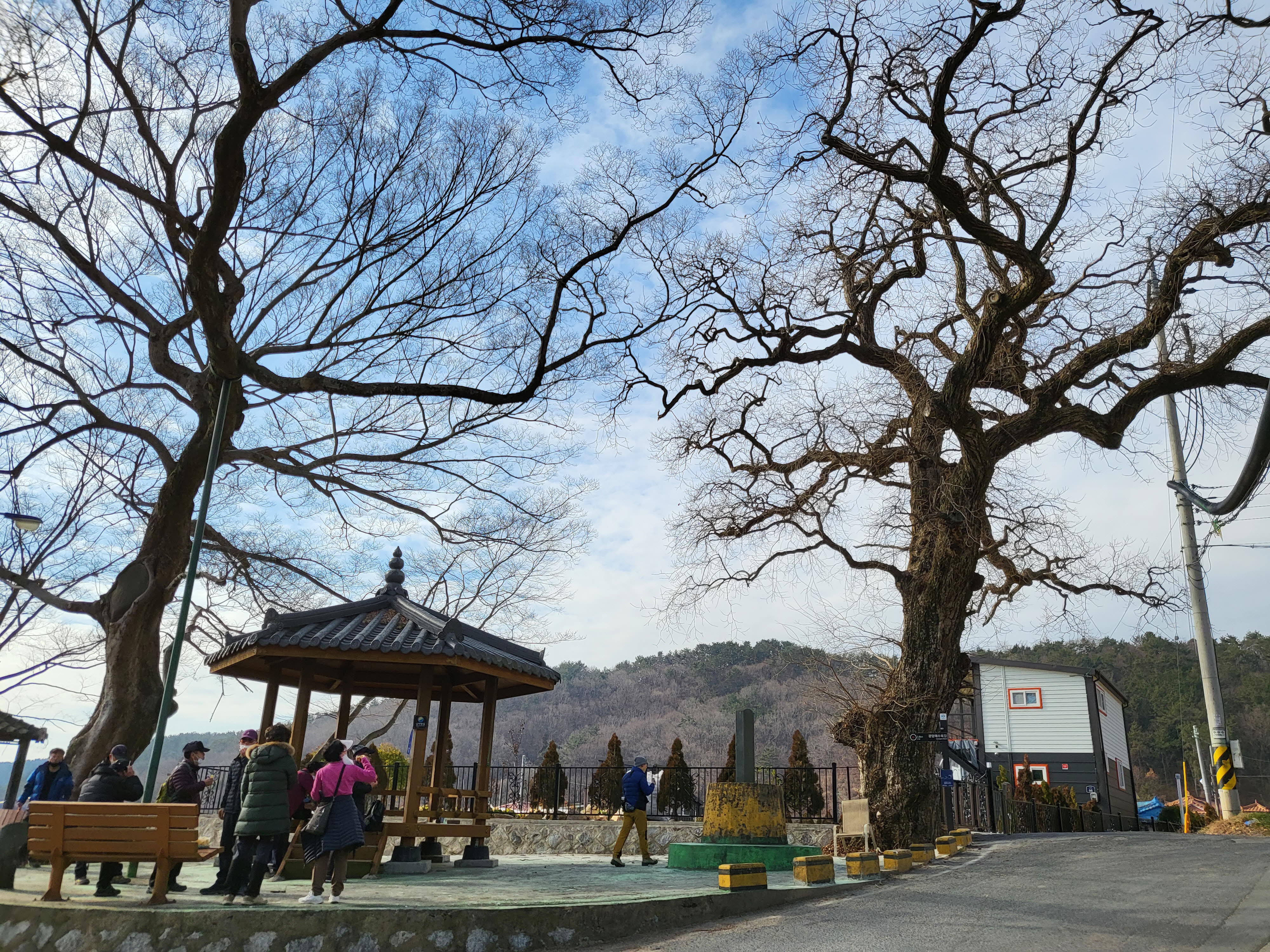 바람으로 목욕을 한다는 다구리 마을 풍욕대. 오른쪽 왕버들나무 가지가 하늘색과 조화를 이루어 마치 연필로 그린 풍경드로잉같은 느낌을 준다. 왼쪽은 100년 넘은 푸조나무