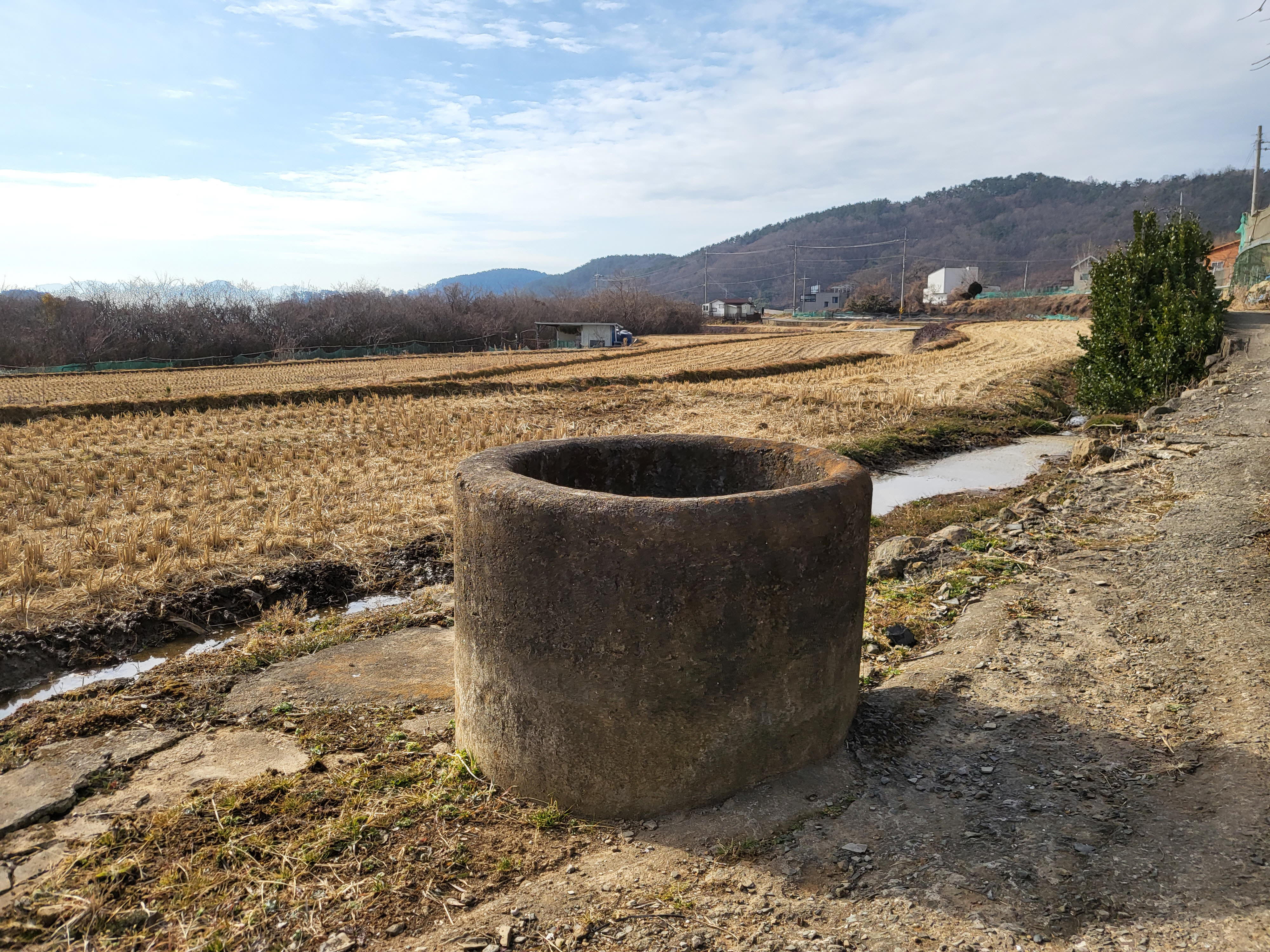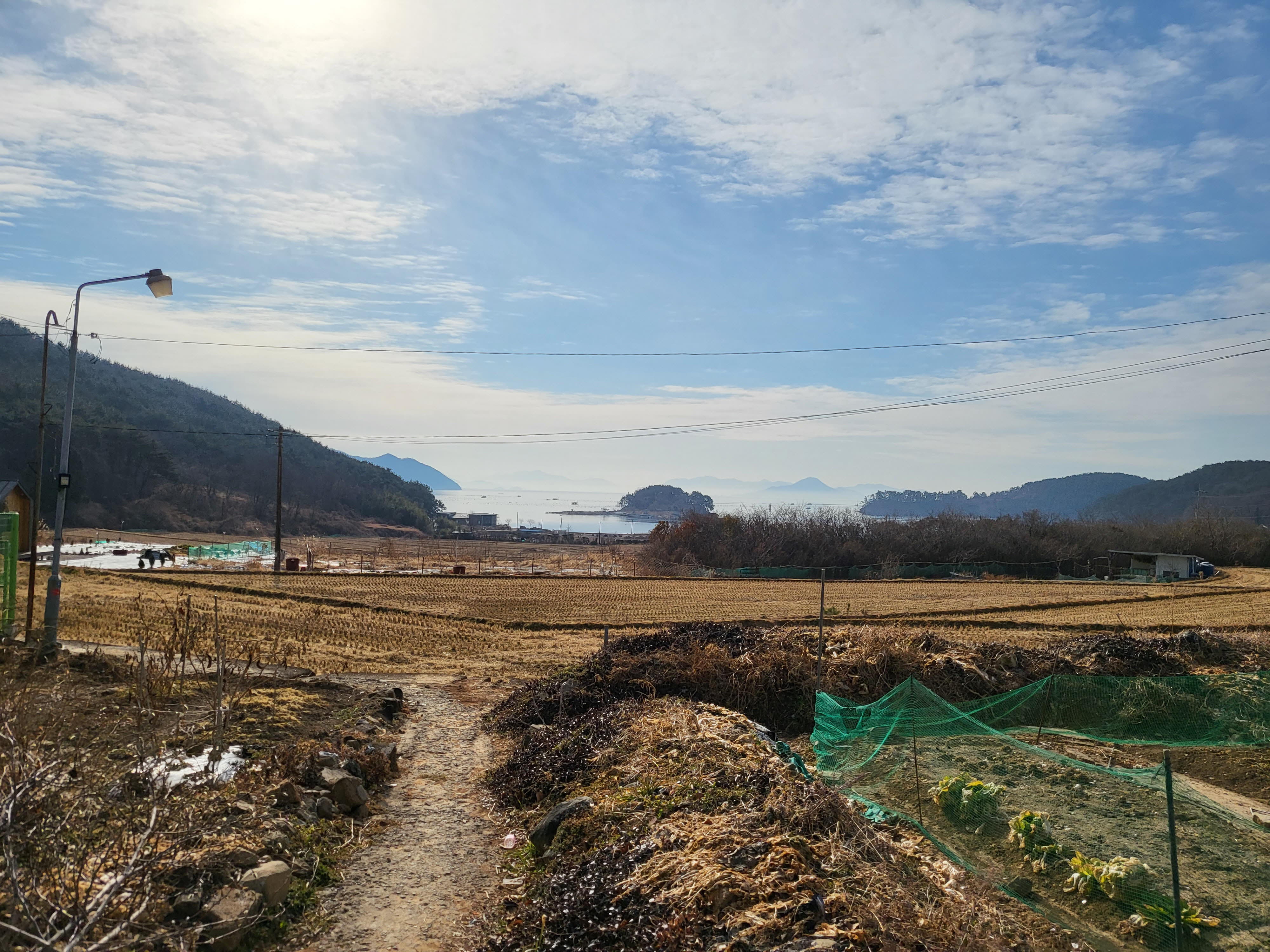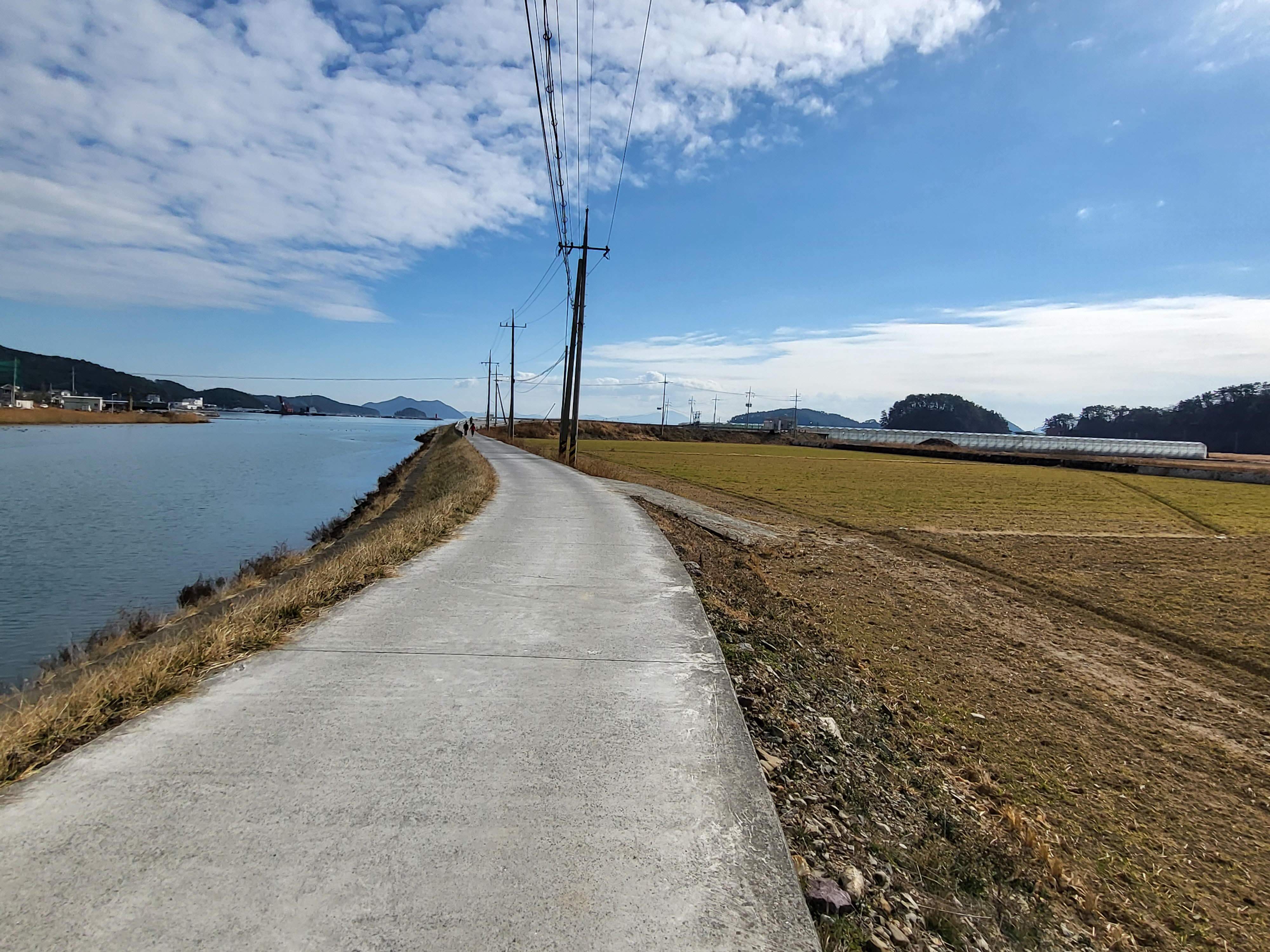 길 양쪽으로 추수 끝난 논과 밭이 펼쳐져 있다.