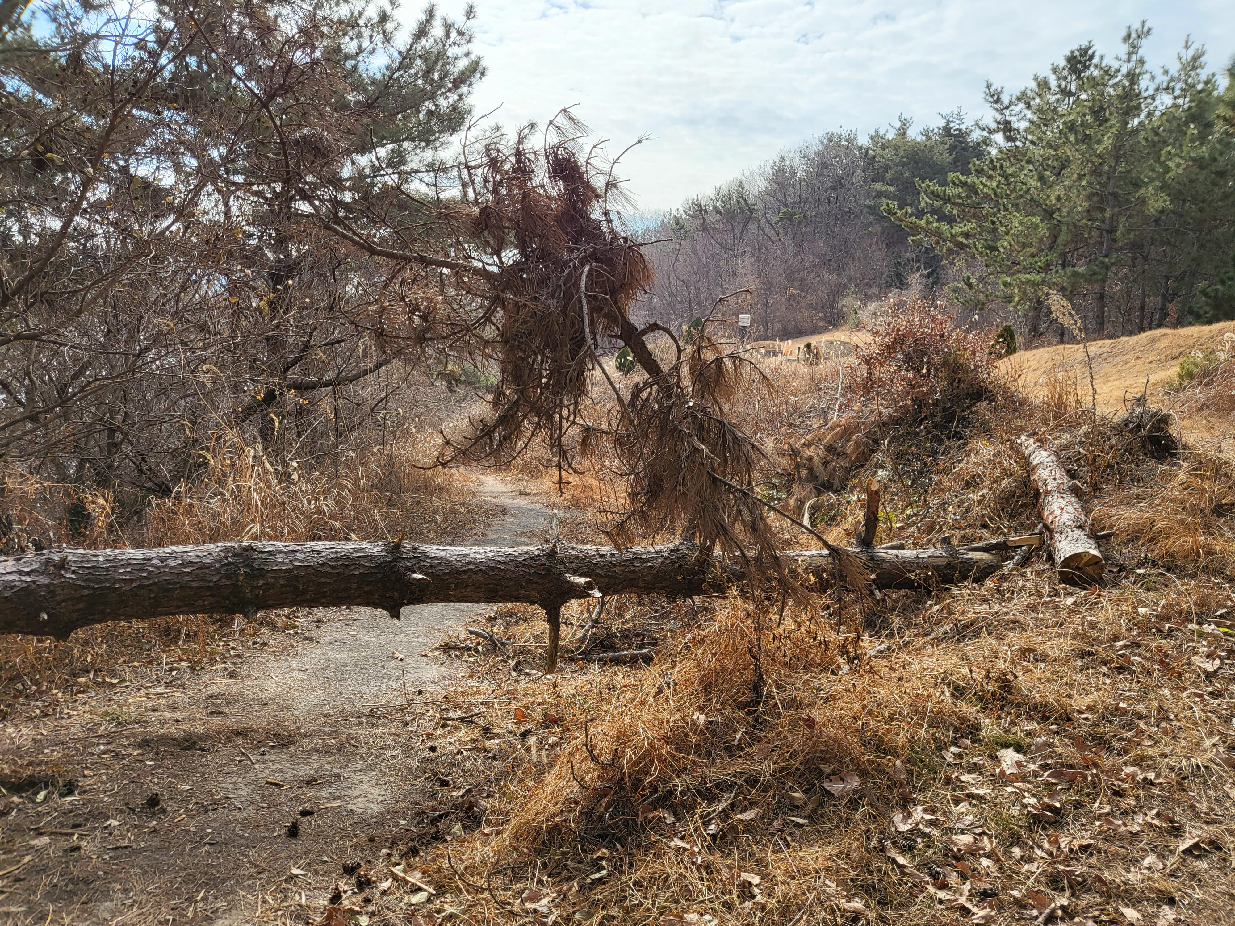 아름드리 소나무한그루가 길위로 쓰러져 길을 가로 막고 있다. 사람 통행이 많지 않은 탓인지 방치해두었다