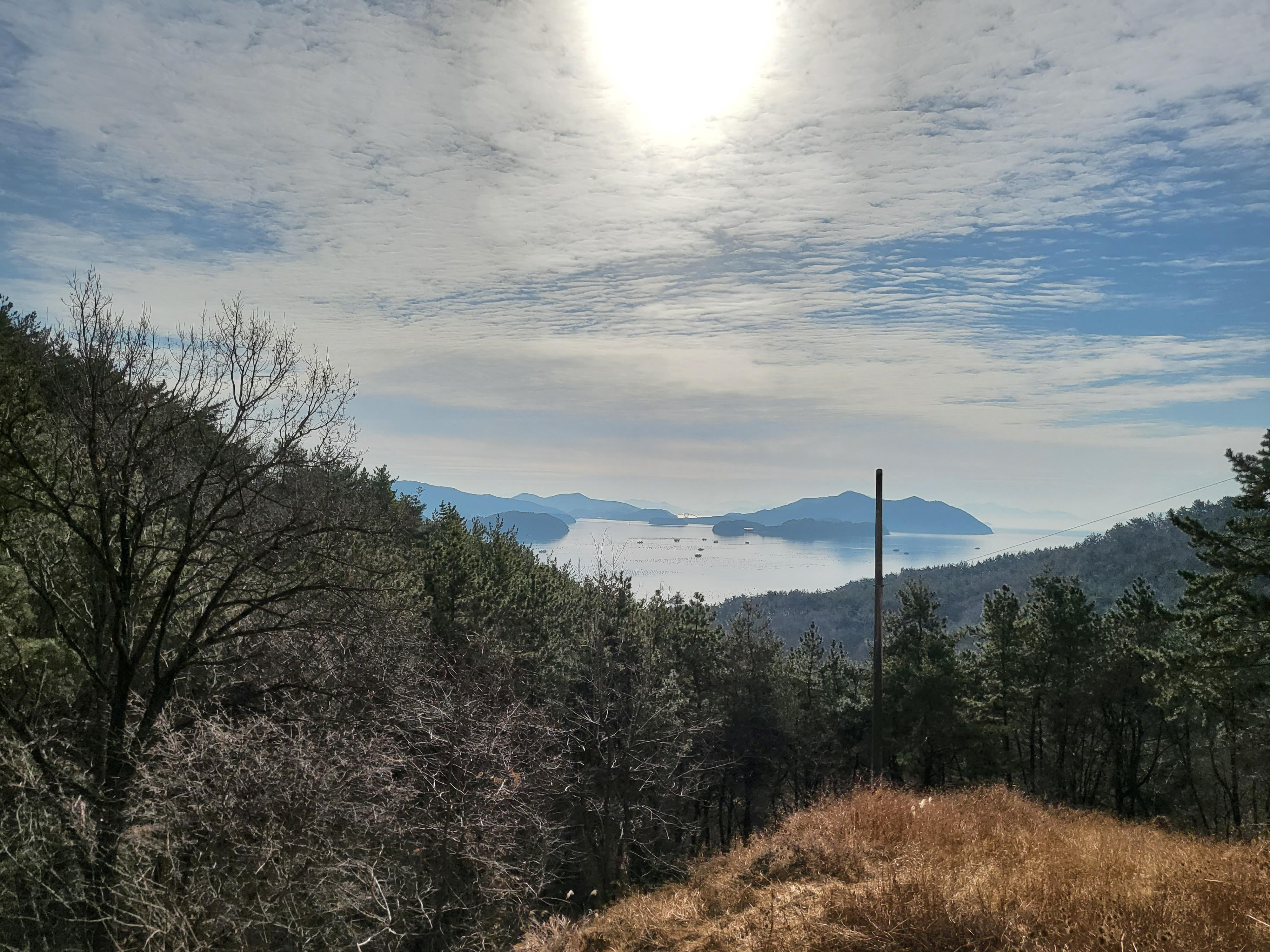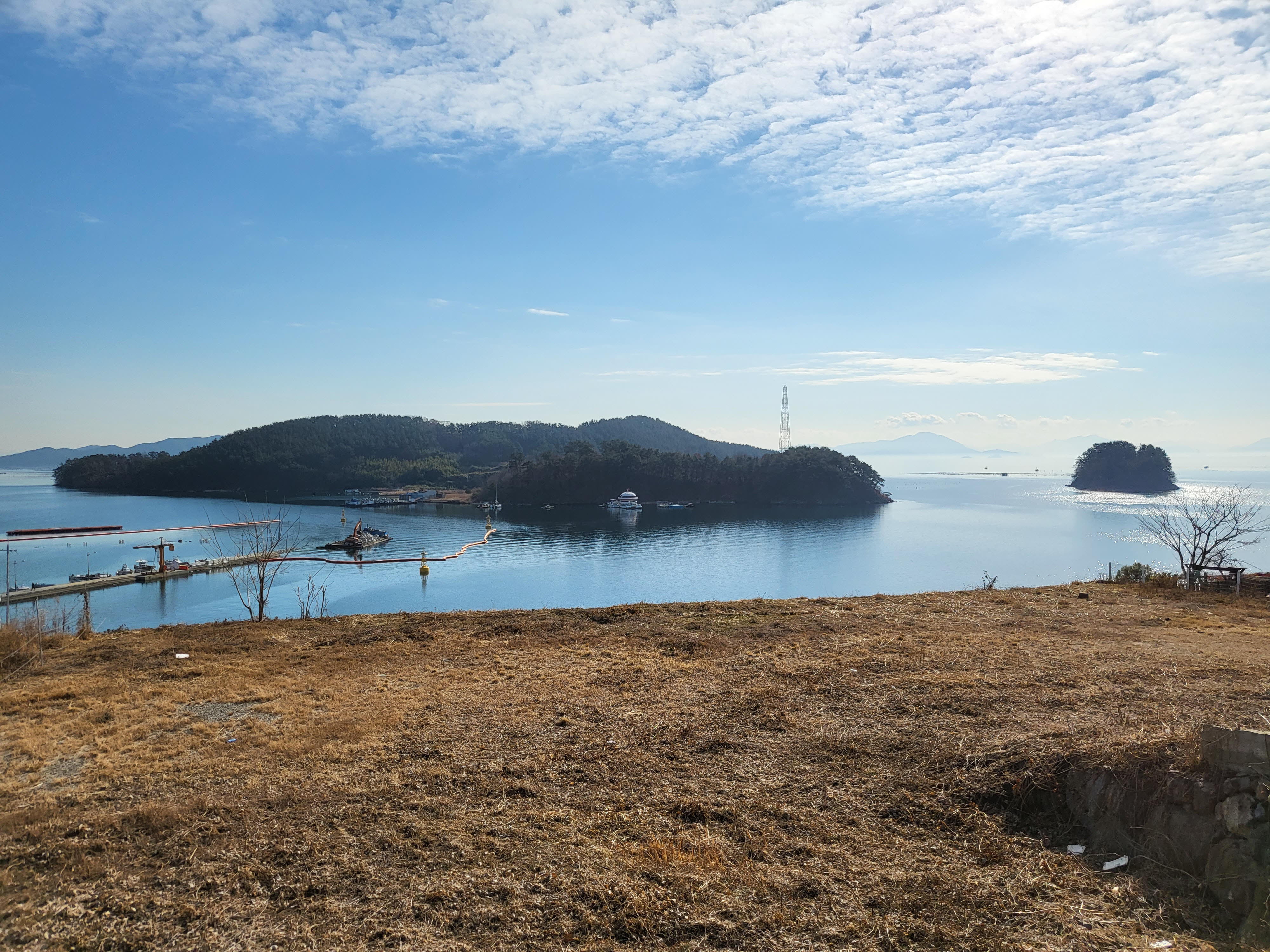언덕위 정자에 앉아 진동만을 내려다보며 계란과 떡, 커피한잔으로 시장기를 달랜다.