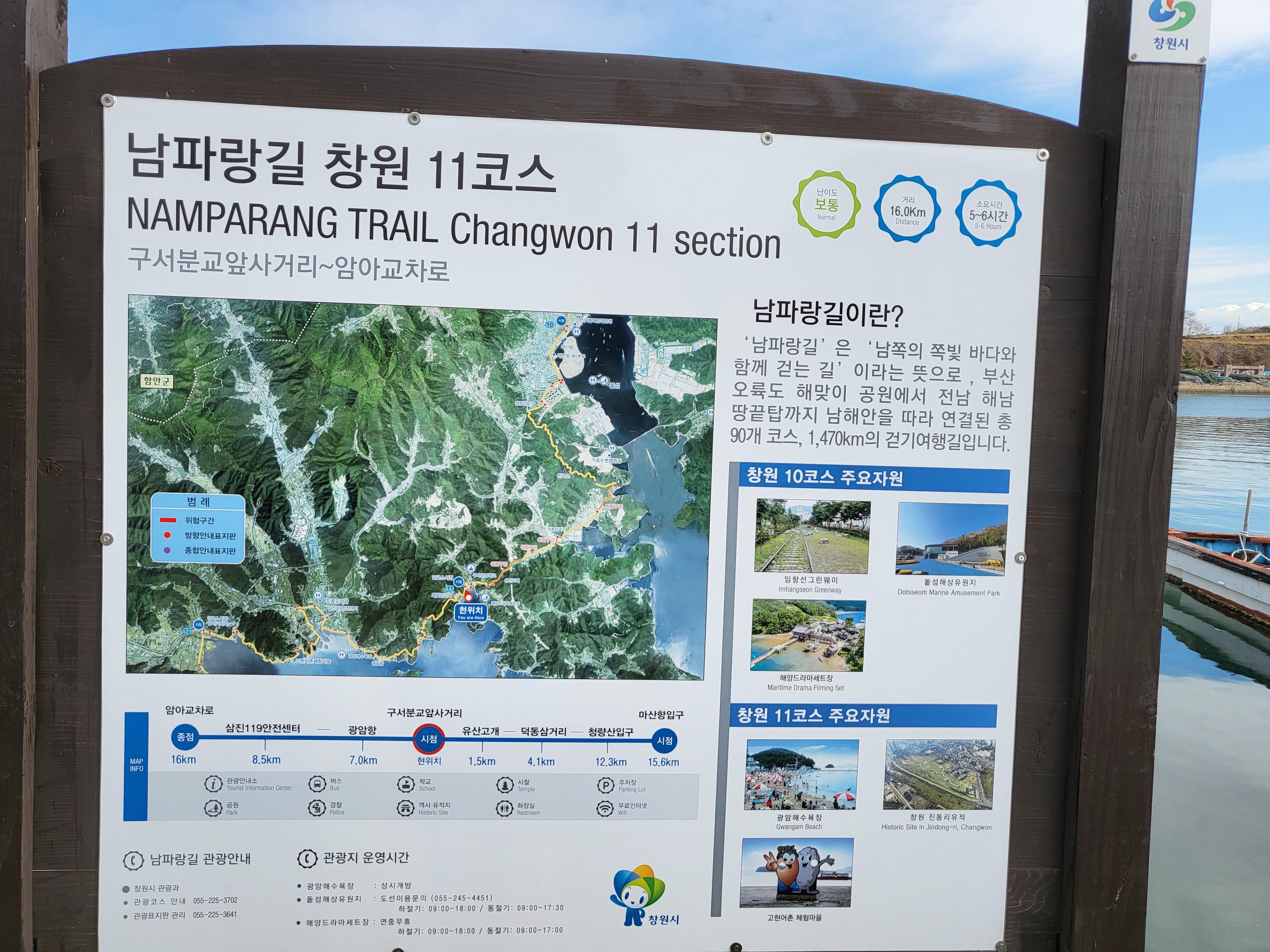 남파랑길 11코스는 마산 구서면 구산초등학교 구서분교 주차장에 주차하고 고성군 경계지점인 암아 사거리까지 걸어가는 총길이 약 16km 5시간 정도 소요되는 길로 차도와 방죽, 해안길로 이루어진 평이한 코스이다.